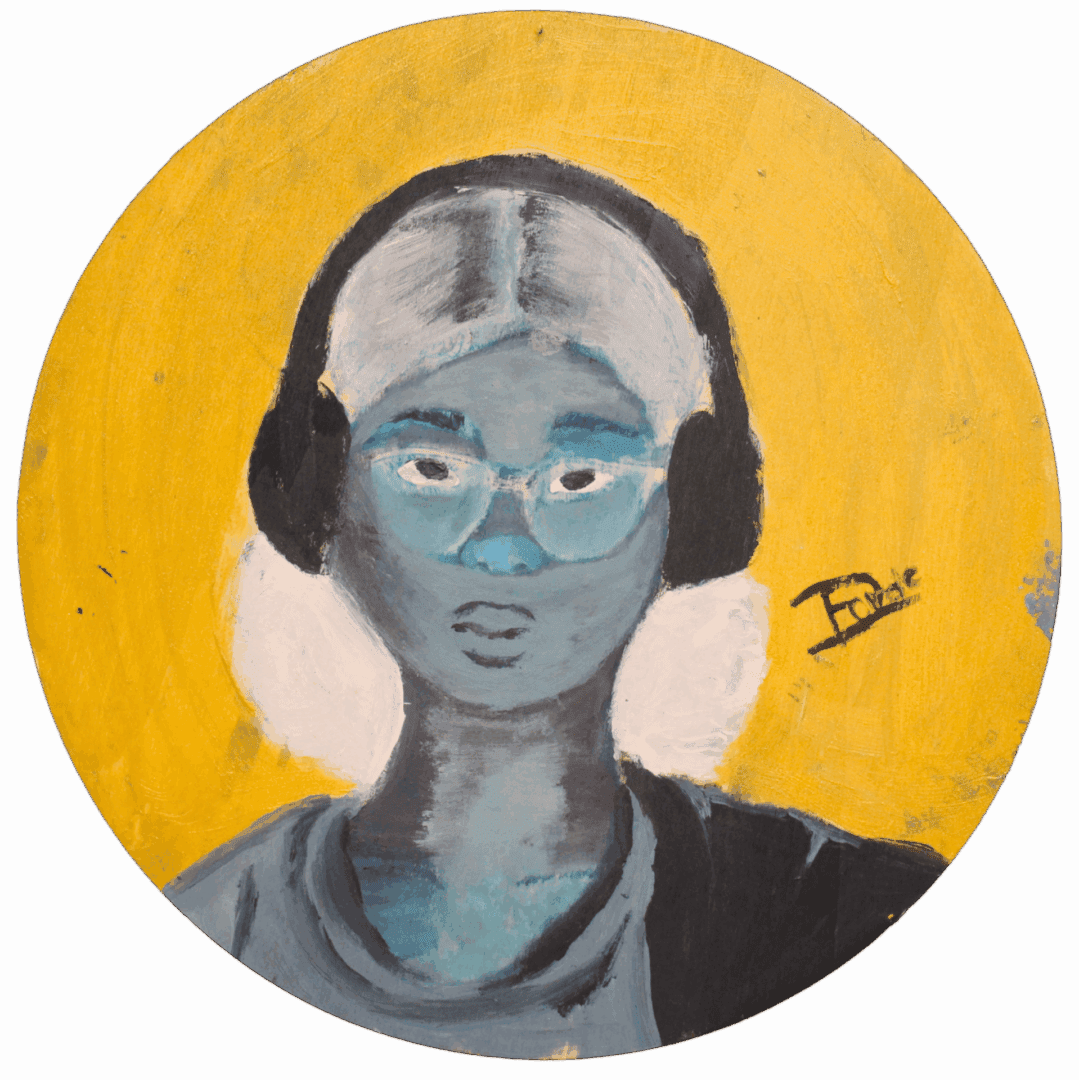 Self portrait on a wooden circle with inverted colours